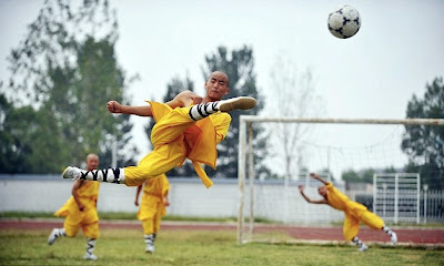 Shi Yanlu, el capitán de los monjes Shaolin, afirma que las disciplinas del kung fu podrán beneficiar a los futbolistas de su país para lograr mejorar el nivel de su juego.Alrededor de 2.000 niños menores de diez años de edad aprenden kung fu en el antiguo monasterio de la provincia de Henan, de los cuales 40 elegidos han comenzado entrenamiento de fútbol.Lo harán bajo la supervisión de expertos en artes marciales y ex futbolistas internacionales, entre los que (por ahora) no se encuentra Eric Cantoná ni el holandés De Jong, maestros en dar patas de kung-fu con chimpunes.