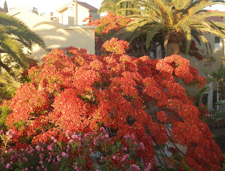 Durante mis paseos hacia la playa veo muchos árboles, algunos llenos de pájaros alborotados, las higueras con su dulce perfume al lado de granados y papayeros, las palmeras con sus dátiles en lo alto, los árboles de orquídeas, los árboles de coral, los tuliperos de Gabón y los flamboyan que alegran el paisaje con sus llamativas y abundantes flores color naranja fuego.