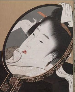 En cuanto a su marido, y sin que ella lo supiera, sacó un trozo de seda verde de su caja fuerte y la extendió sobre el aparador del toko no ma. Allí encima colocó el espejo, dentro de su caja de madera blanca. Cada mañana a primera hora, y cada noche a última, se dirigía al aparador del toko no ma y hablaba con su padre. Compartieron muchas alegres conversaciones y muchas sonoras carcajadas, y el hijo era el hombre más feliz de los contornos, pues era un hombre simple.